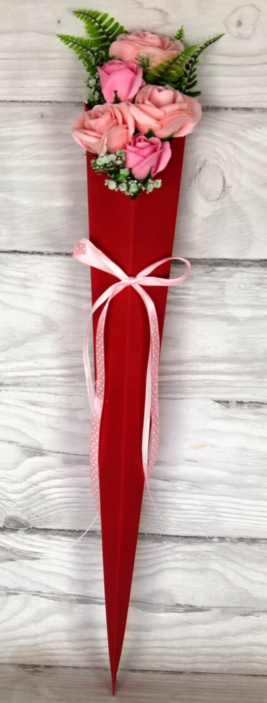 Bukiet 5 kwiatów mydlanych zapakowany w papierowy rożek z dodatkiem sztucznych roślin, ozdobiony długą tasiemką.